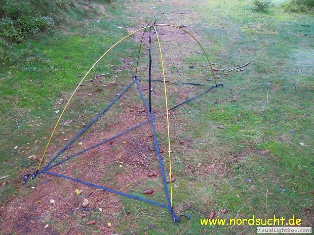 An meinem treuen Agadir Zelt störte mich schon immer, das eine Nutzung ohne Innenzelt nicht möglich war. Bei Winter- und Bergtouren könnte ich getrost auf mein Innenzelt verzichten. Also besorgte ich mir 4 passende Gestängefüße sowie ein paar Meter Verstärkungsband und zerschnitt 4 kleine Meru Spanngurte. Das alles habe ich in den Abmaßen des Innenzelt vernäht. Zum Fixieren der Gestängebögen und der Firststange habe ich erstmal einen Spanngurt verwendet. Später werde ich dort einen Gestängkreuzclip von MSR verwenden. Der ganze Innenzeltersatz wiegt nun anschließend 98g. Eine weiter Möglichkeit bestünde darin die Abspannpunkte gleich an eine passende Zeltunterlage zu vernähen, allerdings besteht dann immer mal wieder die Gefahr das Regenwasser perfekt über die Zeltaußenwand abläuft und in großen Mengen den Weg ins Innere des Zeltes findet.