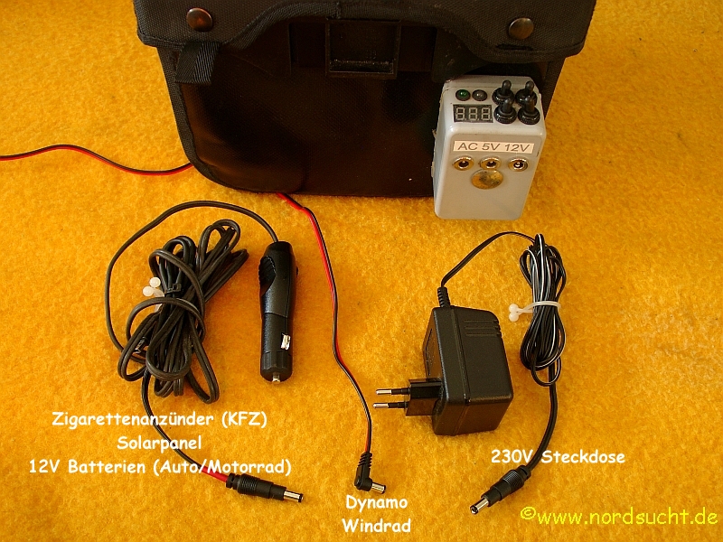 Als Basis sollte eine Elektronik für Fahrraddynamos verwendet werden. Der Markt ist voll von lustigen kleinen Spannungswandlern mit deren Hilfe man sein Handy am Dynamo des Fahrrades aufladen oder betreiben kann. Leider ist der Wirkungsgrad und die Flexibilität der Geräte eher mau und meinen Anwendungsbereiche deckten sie auch kaum ab. Im Internet stieß ich auf die Seite forumslader.de. Dort haben 2 Brüder sich der Sache angenommen und privat eine sehr interessante Schaltung entwickelt. Die aktuellen Bausätze gehen richtig mit der Zeit, sogar von Bluetooth und Apps ist nun da die Rede. Funktionsbedingt bassiert die Schaltung auf reparaturunfreundlicher SMD-Technik, aber die alte Version ist auch noch verfügbar und kann nur empfohlen werden! Um das Optimum aus dem Dynamo heraus zu holen, ist die Gleichrichtung der Eingangspannung per Hand umschaltbar. Für Geschwindigkeiten unter 20km/h wird nach Delon gleichgerichtet, ab 20km/h nach Grätz. So ist der Wirkungsgrad bei niedrigem ebenso gut wie bei hohem Tempo. Das System erschien mir perfekt, so das ich eine leere Platine bestellte und die Schaltung nach meinen Vorstellungen optimierte. Zusammen mit einem 12V Pufferakku, und diversen Kabeladaptern habe ich den für mich perfekten Multilader gebastelt. Verbaut habe ich den fertigen Multilader an einer Ortlieb Ultimate 5 Classic. Im Inneren befindet sich der Pufferakku. Ich habe dazu 12 Eneloopsakkus in Reihe geschaltet und einen doppelten Boden eingebaut. Der Aufbau ist nun so gestaltet das ich während der Fahrt und je nach Auslastung auch im Stand für mehrer Stunden eine 12V Spannung wie in allen PKWs zu Verfügung habe. Also alles was im PKW zu laden und zu benutzen ist (außer böse Stromfresser wie z.B. Heizgeräte) läuft nun auch tadellos an meinem Multilader. Ich versuche auf meinen Reisen ausschließlich Geräte mit Mignonzellen zu verwenden, so kann man immer mal hin und her tauschen und im Notfall sind Mignonzellen fast überall käuflich zu erweben. In diesem Zusammenhang möchte ich meinen Varta Mignon Lader erwähnen, welcher sich hervorragend für Outdooraktivitäten meiner Art eignet. Das Gerät stelle ich hier genauer vor. Im Fazit bin ich äußerst zufrieden mit meinem Gerät. Sind Die völlig entladen 10 Eneloopsakkus (Gesamtspannung dann ca. 4V) sind nach einem 7h Fahrtag bei einem Schnitt von 16-18km/h und gleichzeitig permanenter Navigationsgeräteversorung mit Licht fast völlig aufgeladen. Ein aufgeladener Pufferakkus und einen vollen Tag Radfahren schafft es auch mein komplett entladenes Netbook (Asus Eee PC 900) bis auf 70% zu laden. Mit einer Pufferakkuladung allein schafft der Multilader das Netbook auf 40% zu laden. Praktische Erfahrungen im Einsatz mit dem Lader kann man hier (folgt) lesen. Die nächsten Bilder sollen den Leistungsumfang des Gerätes deutlich machen. Zurzeit bastle ich an einer neueren Version, die deutlich kompakter und weniger anfällig sein wird als die aktuelle Version. Auch wird es in Zukunft möglich sein die komplette Lichtanlage des Fahrrades, vor allem meine Eigenbau LED-Scheinwerfer, besser zu integrieren. (Licht/Rücklicht/Standlichtfunktionen) |