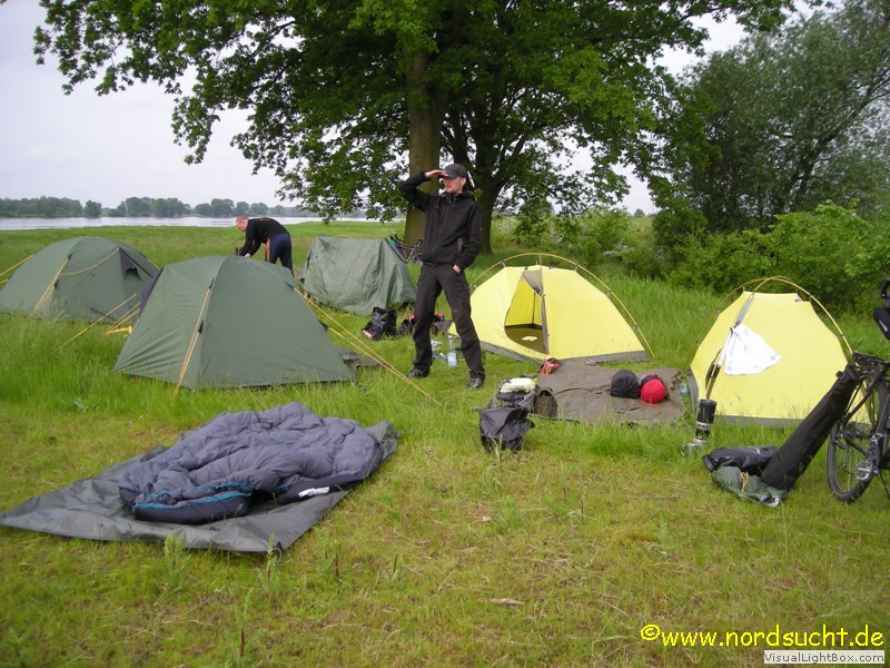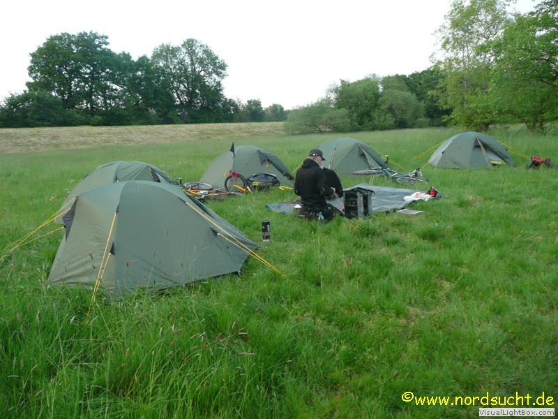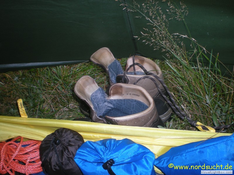 Die ganze Nacht saßen wir im Zelt mit fertig gepacktem Rucksack, und erwarteten jeden Moment das Zeltgestänge bricht. Beide Zelte haben diesen Sturm sowie den Regen fast schadlos überstanden. Lediglich die Firststange hat nun auf ihrer Länge von ca. 1,40m einen leichten Bogen mit ca. 1cm „Versatz“. Als wir wieder zu Hause waren, haben wir bei Wetter.com nachträglich die Wetterberichte durchgeschaut. In der besagten Nacht gab es in unserem Bereich Windböen von 149km/h und Windstärken von 9-10.