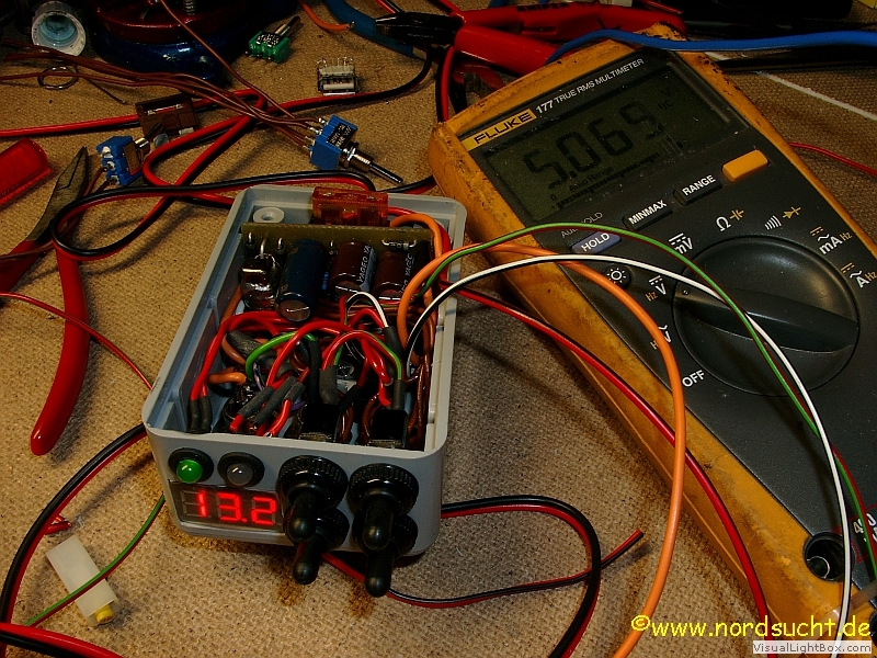 Als Basis sollte eine Elektronik für Fahrraddynamos verwendet werden. Der Markt ist voll von lustigen kleinen Spannungswandlern mit deren Hilfe man sein Handy am Dynamo des Fahrrades aufladen oder betreiben kann. Leider ist der Wirkungsgrad und die Flexibilität der Geräte eher mau und meinen Anwendungsbereiche deckten sie auch kaum ab. Im Internet stieß ich auf die Seite forumslader.de. Dort haben 2 Brüder sich der Sache angenommen und privat eine sehr interessante Schaltung entwickelt. Die aktuellen Bausätze gehen richtig mit der Zeit, sogar von Bluetooth und Apps ist nun da die Rede. Funktionsbedingt bassiert die Schaltung auf reparaturunfreundlicher SMD-Technik, aber die alte Version ist auch noch verfügbar und kann nur empfohlen werden! Um das Optimum aus dem Dynamo heraus zu holen, ist die Gleichrichtung der Eingangspannung per Hand umschaltbar. Für Geschwindigkeiten unter 20km/h wird nach Delon gleichgerichtet, ab 20km/h nach Grätz. So ist der Wirkungsgrad bei niedrigem ebenso gut wie bei hohem Tempo. Das System erschien mir perfekt, so das ich eine leere Platine bestellte und die Schaltung nach meinen Vorstellungen optimierte. Zusammen mit einem 12V Pufferakku, und diversen Kabeladaptern habe ich den für mich perfekten Multilader gebastelt. Verbaut habe ich den fertigen Multilader an einer Ortlieb Ultimate 5 Classic. Im Inneren befindet sich der Pufferakku. Ich habe dazu 12 Eneloopsakkus in Reihe geschaltet und einen doppelten Boden eingebaut. Der Aufbau ist nun so gestaltet das ich während der Fahrt und je nach Auslastung auch im Stand für mehrer Stunden eine 12V Spannung wie in allen PKWs zu Verfügung habe. Also alles was im PKW zu laden und zu benutzen ist (außer böse Stromfresser wie z.B. Heizgeräte) läuft nun auch tadellos an meinem Multilader. Ich versuche auf meinen Reisen ausschließlich Geräte mit Mignonzellen zu verwenden, so kann man immer mal hin und her tauschen und im Notfall sind Mignonzellen fast überall käuflich zu erweben. In diesem Zusammenhang möchte ich meinen Varta Mignon Lader erwähnen, welcher sich hervorragend für Outdooraktivitäten meiner Art eignet. Das Gerät stelle ich hier genauer vor. Im Fazit bin ich äußerst zufrieden mit meinem Gerät. Sind Die völlig entladen 10 Eneloopsakkus (Gesamtspannung dann ca. 4V) sind nach einem 7h Fahrtag bei einem Schnitt von 16-18km/h und gleichzeitig permanenter Navigationsgeräteversorung mit Licht fast völlig aufgeladen. Ein aufgeladener Pufferakkus und einen vollen Tag Radfahren schafft es auch mein komplett entladenes Netbook (Asus Eee PC 900) bis auf 70% zu laden. Mit einer Pufferakkuladung allein schafft der Multilader das Netbook auf 40% zu laden. Praktische Erfahrungen im Einsatz mit dem Lader kann man hier (folgt) lesen. Die nächsten Bilder sollen den Leistungsumfang des Gerätes deutlich machen. Zurzeit bastle ich an einer neueren Version, die deutlich kompakter und weniger anfällig sein wird als die aktuelle Version. Auch wird es in Zukunft möglich sein die komplette Lichtanlage des Fahrrades, vor allem meine Eigenbau LED-Scheinwerfer, besser zu integrieren. (Licht/Rücklicht/Standlichtfunktionen) |